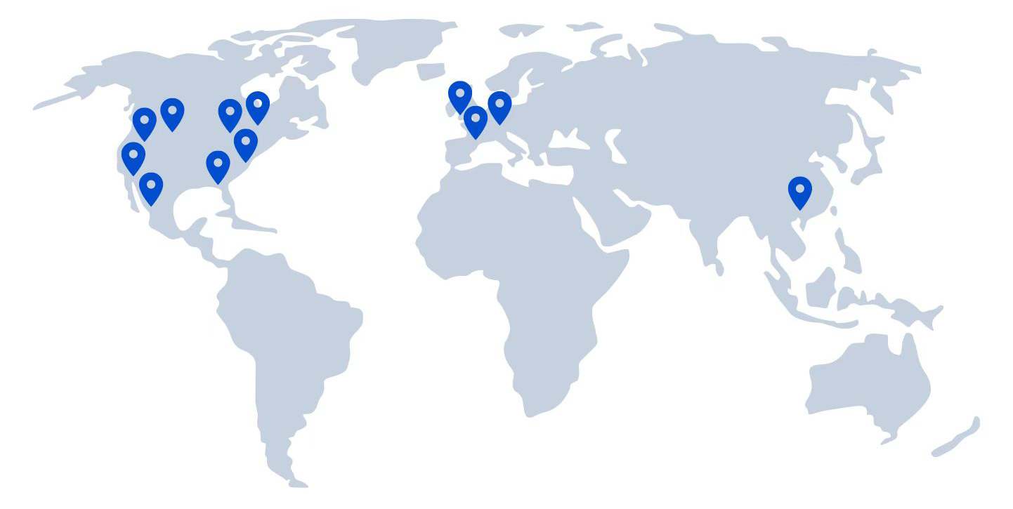 我们在美国、加拿大、英国、德国、法国等10余个目的国运营35+海外仓(含海关监管仓),总面积超1,614,600ft²,重点布局核心节点城市: